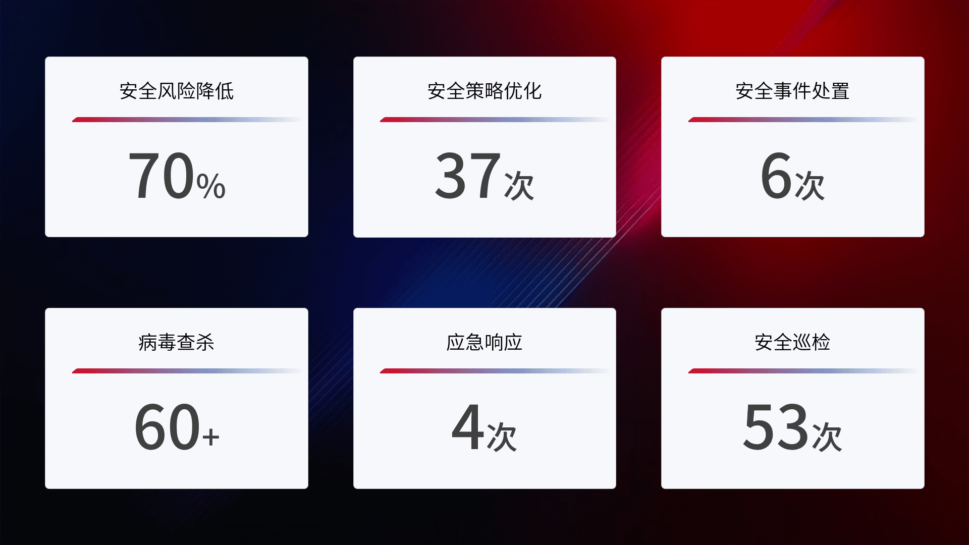 提供全面的安全事件报告体系,,包括处置报告、、、周报、、、季度和年度总结,,结合持续监控,,帮助客户深入了解网络安全状况。。。